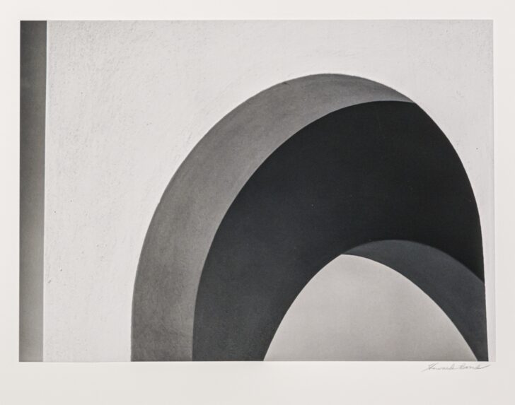 The top of an arched opening forms a half circle across most of the image. The space within is thrown in shadow, stark black against the white stucco exterior wall.