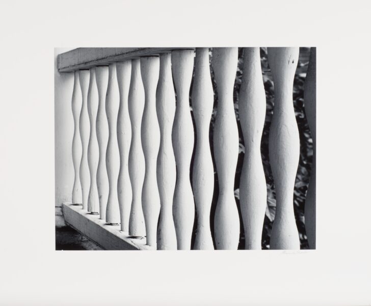 Fourteen painted railings fill the frame of this image, each rounded pole shaped by three curves that would fit into the next rail.