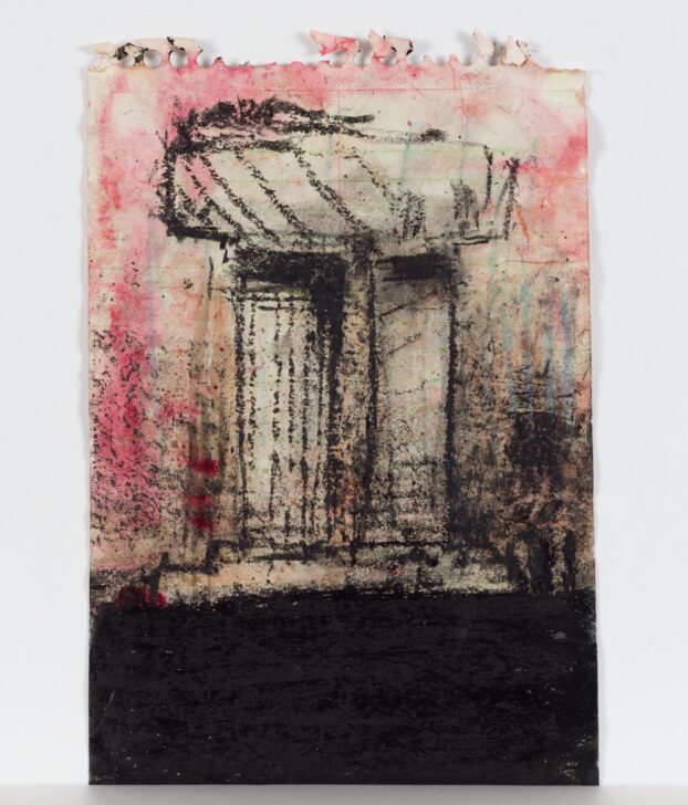 A two-columned architectural element drawn in heavy black lines with some red and blue, with the bottom portion of the foreground shaded in black. Diagonal red lines cross the center horizontally, and the background has a sepia tone and black shading. The piece is drawn on paper from a spiral notebook, with the ringed cutouts and tears visible at the top.