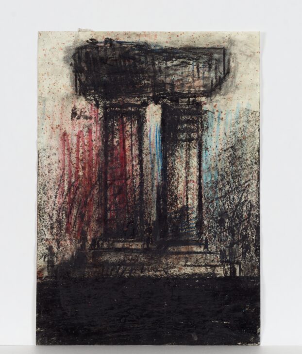 A two-columned architectural element is drawn in black, blue, and red, with the bottom portion of the foreground shaded in black. The background contains red, blue, and black shading. The piece is drawn on paper from a spiral notebook with the ringed cutouts and tears at the top and light blue horizontal lines visible underneath.