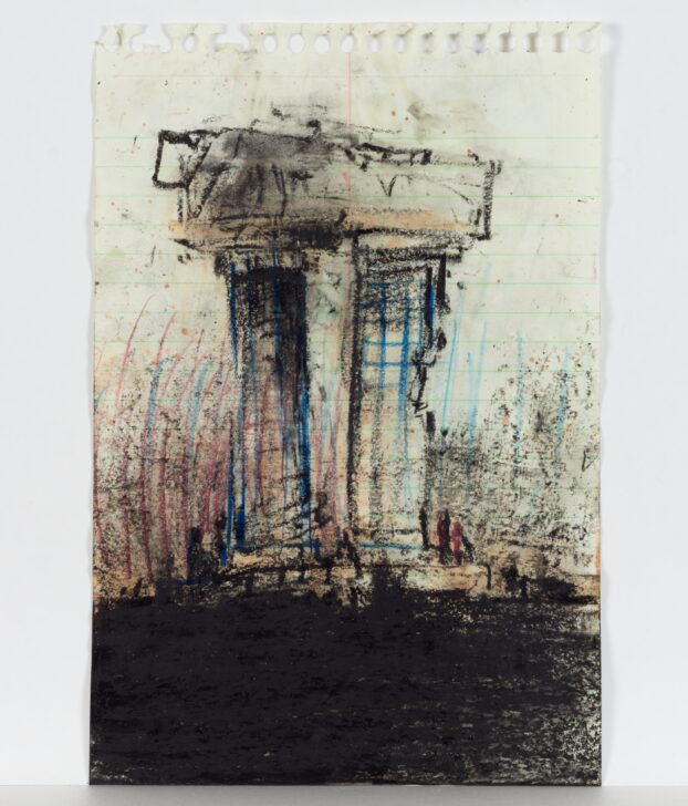 A two-columned architectural element is drawn in black lines, with the bottom portion of the foreground shaded in black. There is red and black shading on the viewer's left and blue and black shading on the viewer's right. The piece is drawn on paper from a spiral notebook, with the ringed cutouts and tears at the top and light blue horizontal lines visible underneath.