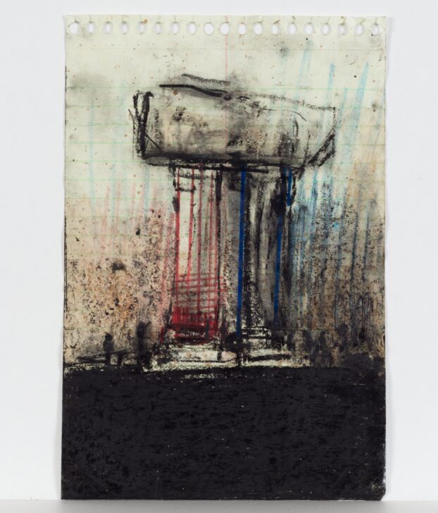 A two-columned architectural element is drawn in black, blue, and red, with the bottom portion of the foreground shaded in black. The background is made up of blue and black shading, and there is white shading across the top of the structure. The piece is drawn on paper from a spiral notebook, with the ringed cutouts and tears visible at the top.