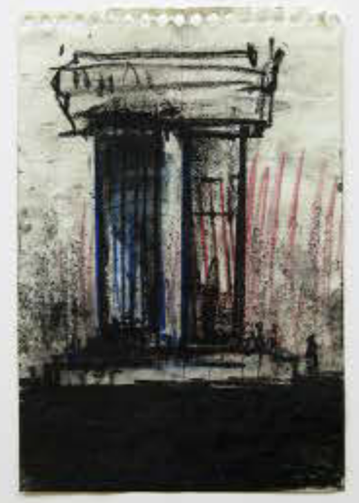 A two-columned architectural element is drawn in black, blue, and red, with the bottom portion of the foreground shaded in black. The background is made up of red and black shading. The piece is drawn on paper from a spiral notebook with the ringed cutouts and tears visible at the top.