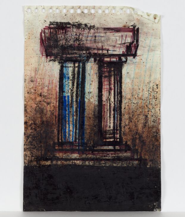 A two-columned architectural element is drawn in red, blue, and black with the bottom portion of the foreground shaded in black. The background is shaded with red and black and has a sepia tone. The piece is drawn on paper from a spiral notebook with the ringed cutouts and tears visible at the top and light blue horizontal lines visible underneath.