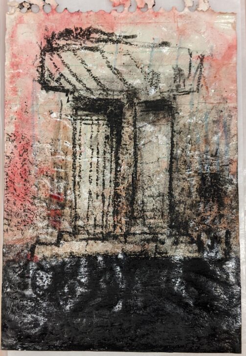 A two-columned architectural element is drawn with black lines, with the bottom portion of the foreground shaded in black. The background contains red, blue, and black shading with some white shading across the columns. The piece is drawn on paper from a spiral notebook with the ringed cutouts and tears at the top and light blue horizontal lines visible underneath.