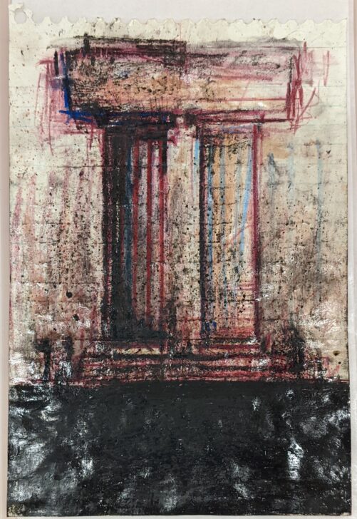 A two-columned architectural element is drawn in red, blue, and black with the bottom portion of the foreground shaded in black. The background is made up of red and black shading. The piece is drawn on paper from a spiral notebook, with the ringed cutouts and tears at the top and light blue horizontal lines visible underneath.