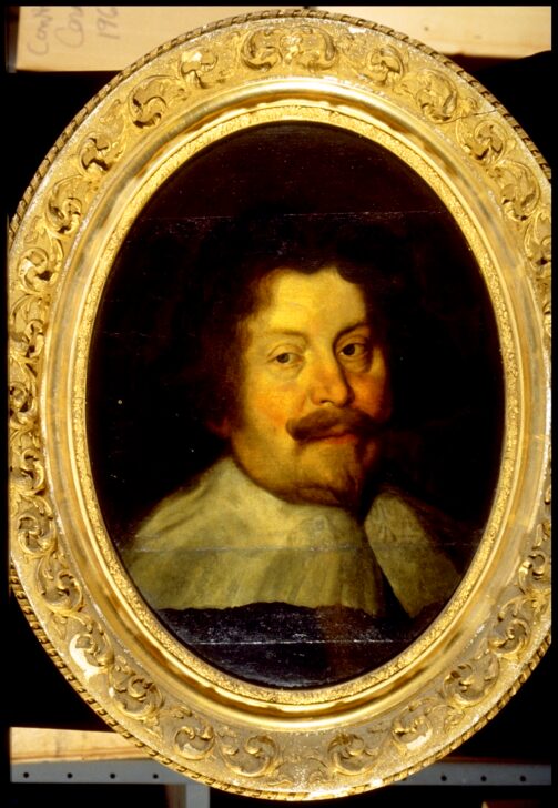 Oval portrait of mustachioed man with white collar against dark backdrop.