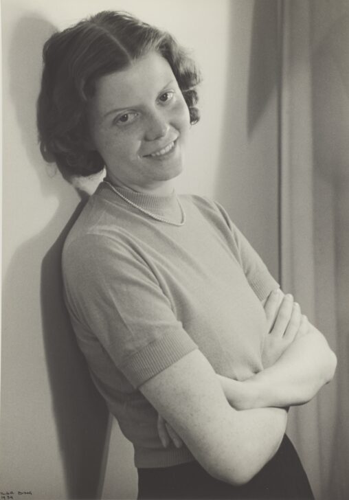 A black-and-white photograph of a woman from the waist up. She leans against the wall, her arms folded, and smiles towards the viewer.