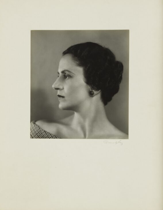 Portrait of a woman from the shoulders up. Her body is turned toward the camera, but her head turns to her right. Her dark, wavy hair is cut just above the nape of her neck, and she wears a large, round earring.