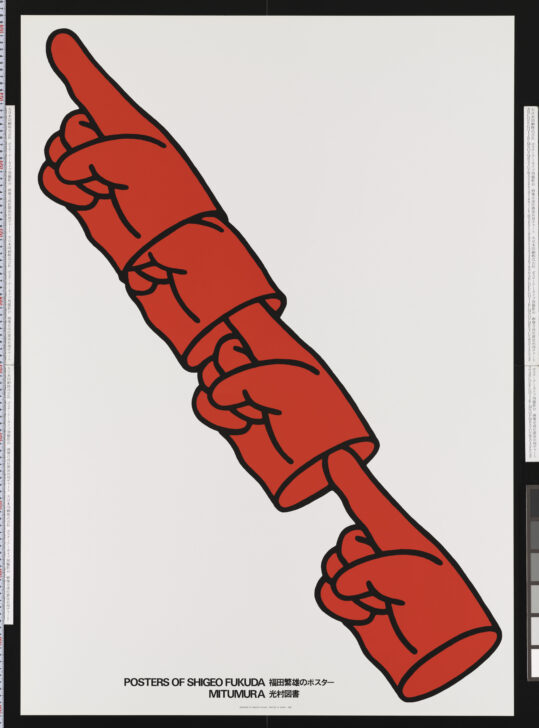 Four nested red and black hands with their index fingers pointing toward the upper left.