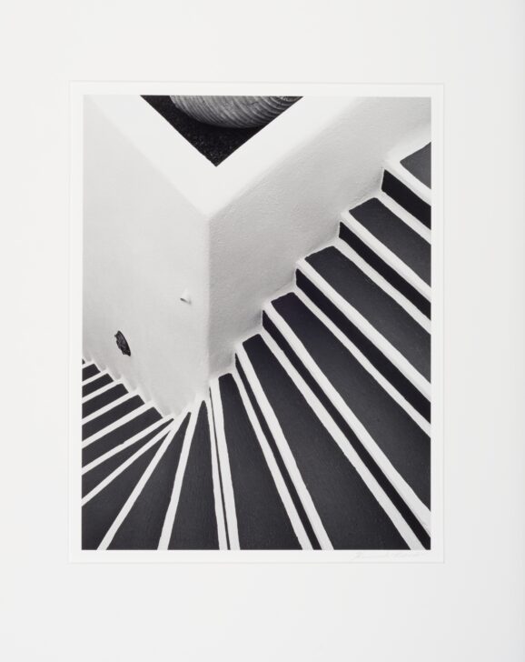 A set of stairs, each step painted partially black, wraps around a white stucco corner.
