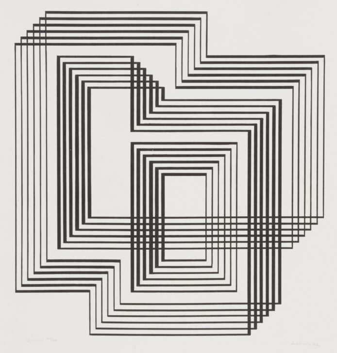 These three lithographs by Josef Albers were made during his time as a faculty member at Black Mountain College, North Carolina, an important institution for the development of modernist art in the United States. Albers had previously taught at the Bauhaus school of design, architecture, and applied arts in Germany, before the Nazi takeover forced him to emigrate. At Black Mountain, he continued to teach the Bauhaus curriculum, pushing students to notice that things as varied as cigarette box labels and a handcrafted chair were designed with equal care. Such attention to the construction of things can be seen in these prints, in which simple black lines and white spaces are used to represent forms that look architectural. Though abstract, these minimal forms are reminiscent of mounds, pyramids, and shrines that Albers and his wife visited during their travels to pre-Columbian archaeological sites.
