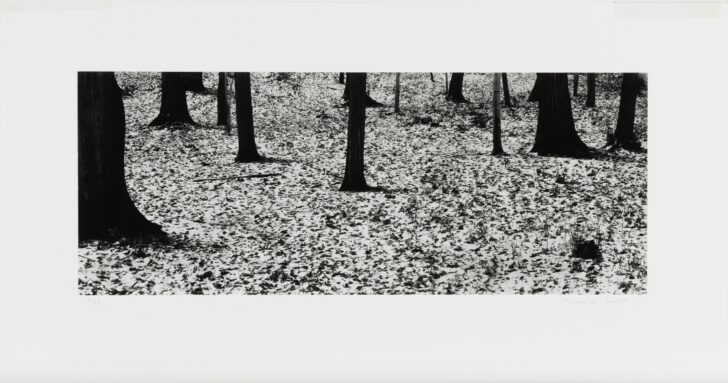 A black-and-white photograph of a forest floor covered in dried leaves.