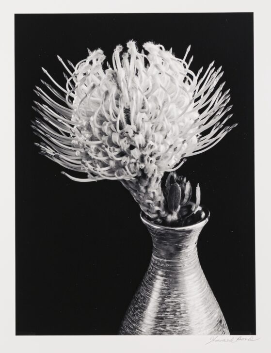 A vase with a pattern of thin, horizontal striping holds a fat-headed flower with light, curling petals surrounded by tiny, pointed stalks.