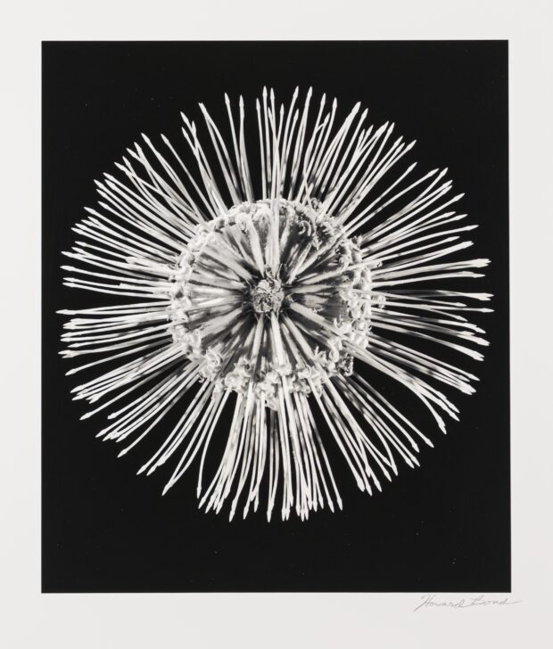 A stemless, circular flower made of dozens of of thin, pointed stalks stands against a black background.