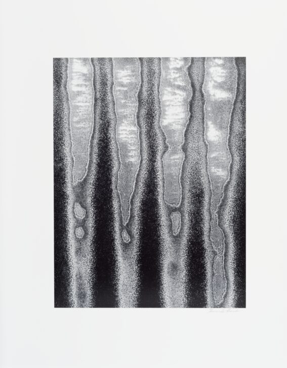 Four long, organic shapes outlined in white descend into a black field, each with a halo of dark to light.