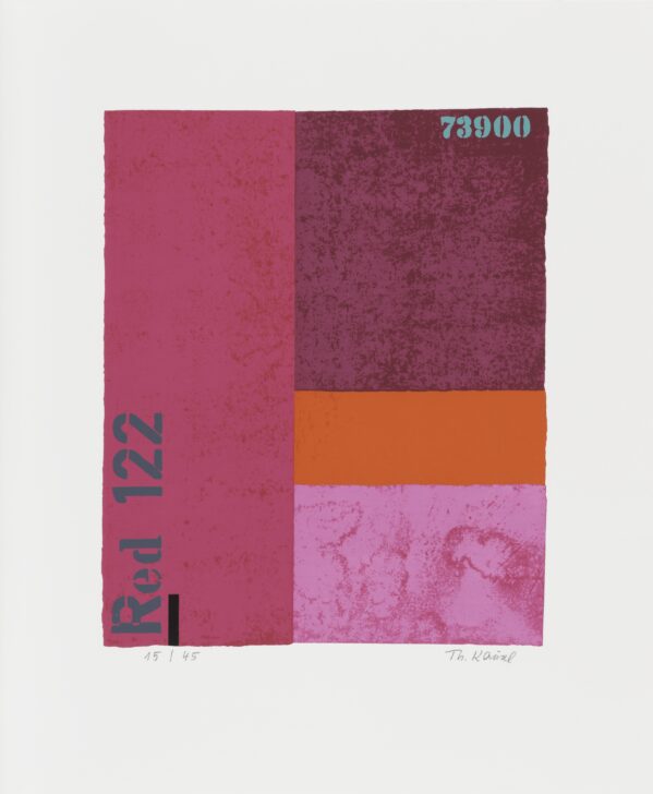 A print comprised of red and pink rectangles of various sizes. A lighter red rectangle makes up the left, a dark red one in the upper right, a bright red one in the middle-right, and a pinkish one forms the lower right portion of the work. "Red 122" appears in gray stenciled lettering up the left side from the bottom left corner. "73900" appears in turqoise stenciled lettering in the upper right corner.