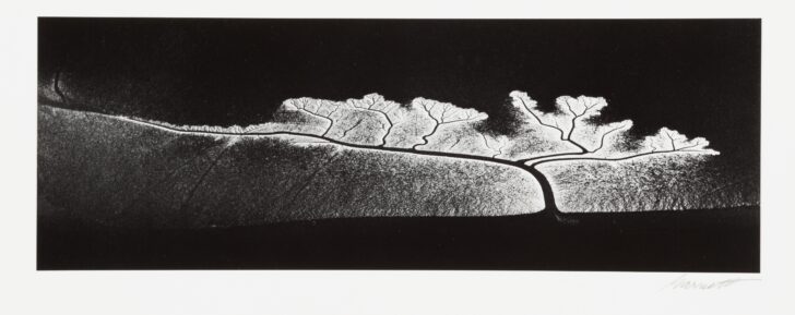 Aerial image of a flowing water creating a leaf-like image on the ground.