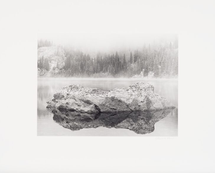 A large rock formation is surrounded on all sides by undisturbed water. A light fog covers the distance from the rock to a forest on the shore.