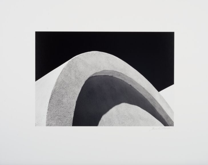The top of a plain, white arch with sharply defined edges stands against a black background, filling the frame.