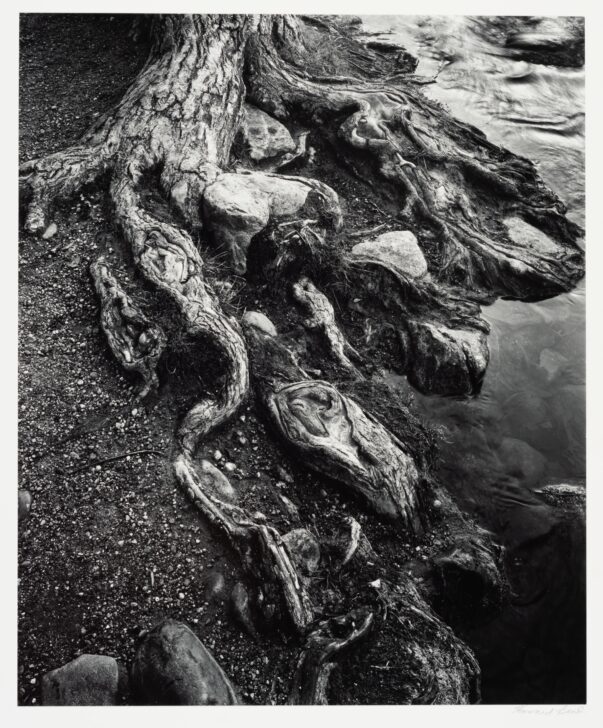 An extensive tree root system forms the bank of a body of water, curling and twisting into thick, rounded lengths.