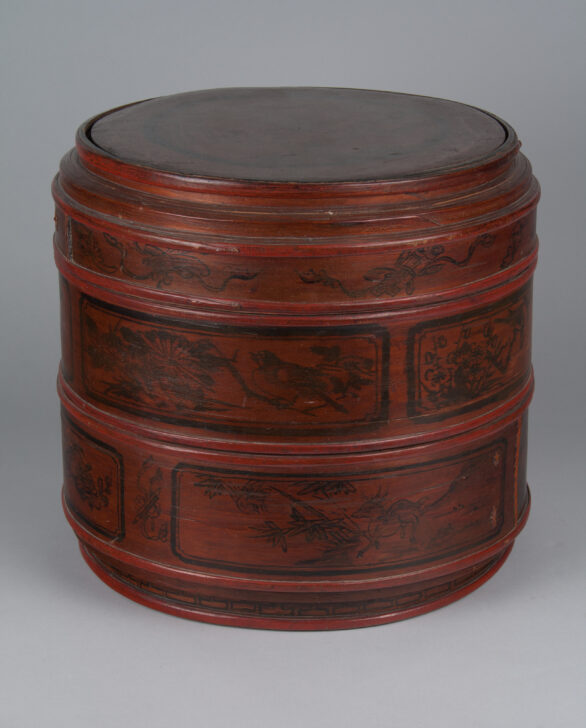 A circular three-tiered box with animal and plant designs painted on the sides.