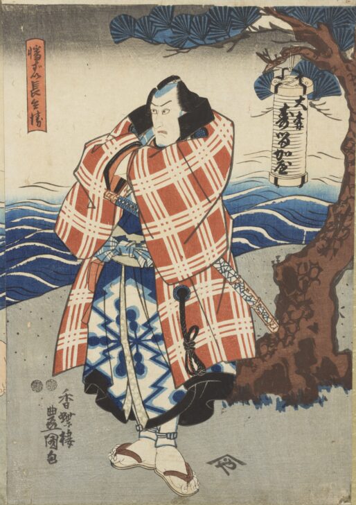 Image of a figure standing beneath a tree near a body of water. The figure is wearing a red, checked robe and looking to the viewer's left.