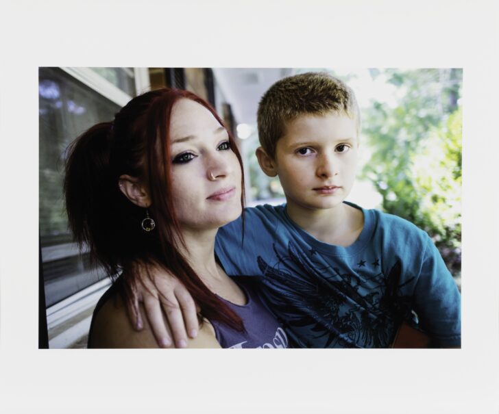 An image of a woman with a young boy. She looks to the right, while he looks toward the viewer, his arm around her neck. They sit outside near a window with green trees visible behind them.