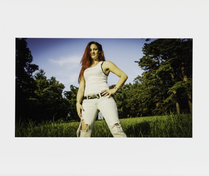 A wide-angle image of a woman standing in a green field with trees in the background. She has bright red hair and wears a white tanktop and white jeans torn around the knees.