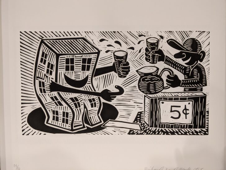 A print in black of two smiling figures facing each other. On the viewer's left, the figure is shaped like a multi-storied building with windows forming eyes and has outstretched arms, holding a glass in one hand. The figure on the viewer's right is shaped like a person and is wearing a baseball cap, with a pitcher in one hand and a glass in the other. This figure is standing behind a structure with a "5" and a cent symbol on it.