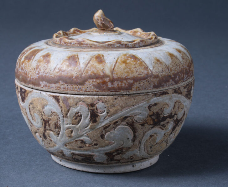 Small-size covered box, with a handle surrounded by a raised stylized calyx, which imitates the growth pattern of the top of a mangosteen, and a band of star points at the rim of the lid. The body has a band of vegetal scrolls. Brown-and-cream glaze.