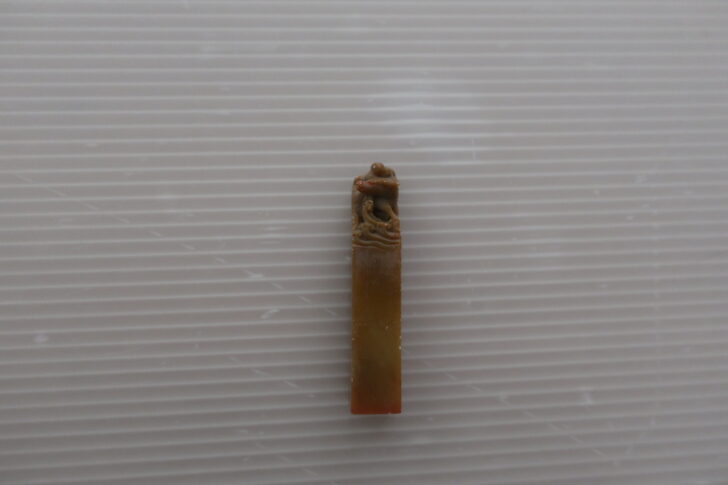 Carved light bunt umber colored block with a delicate carving of a human figure on the back of an animal on the top. The bottom of the block as a carved seal that has red dried pigment residue.