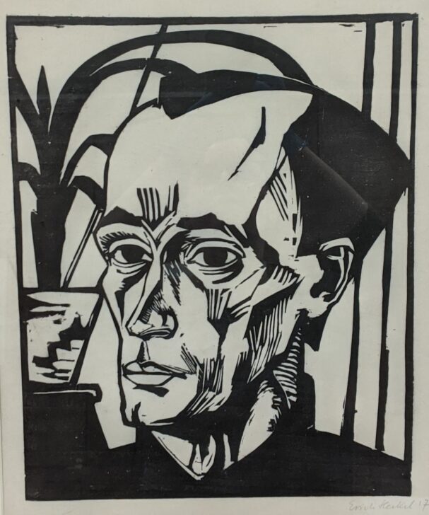 A black and white image of a male figure from the collarbones upward. The figure looks toward the viewer's left and has short dark hair with a receding hairline and prominent widow's peak. There is a potted plant behind the figure's right shoulder.