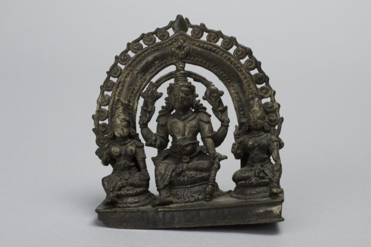 A seated, four-armed figure on a stool or cushion, with two seated figures on each side, each on a lower stool or cushion, all in front of a crescent-shaped backgroud.