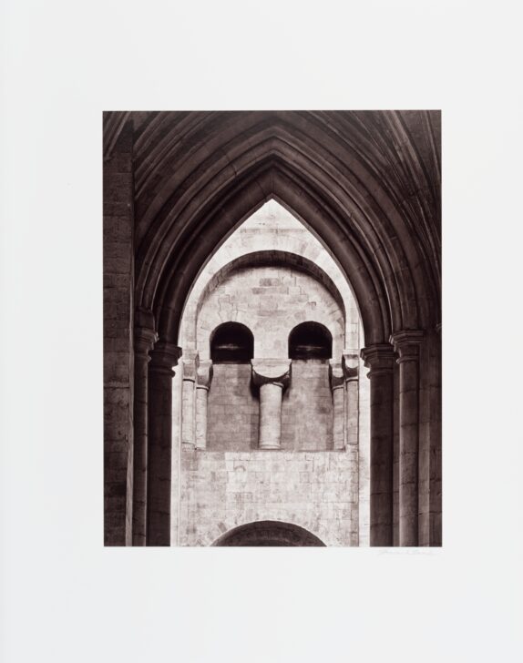 A light stone wall containing two small arched windows is seen through two simple pointed arch doorways.