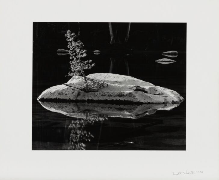 A black-and-white print of a small pine tree emerging from the crevice of a rock. The rock is surrounded by water, which captures a blurry reflection.