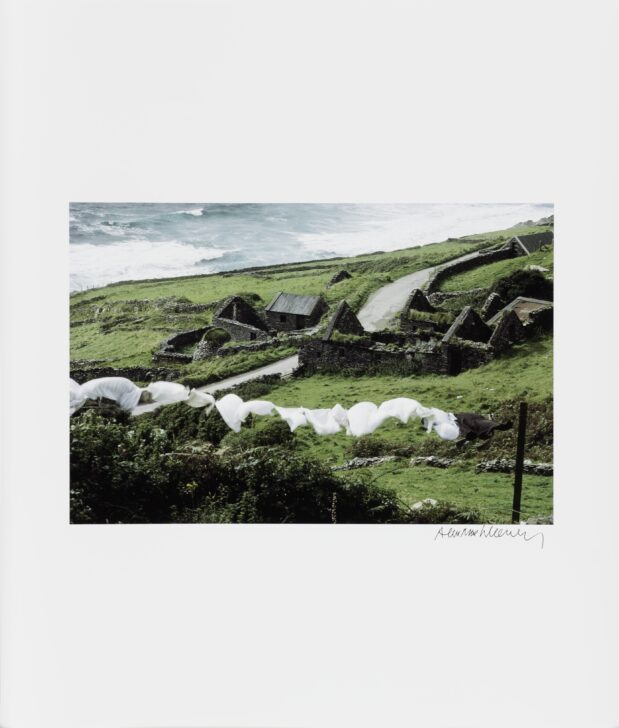 An image of a clothesline fluttering in the wind. A network of stone walls and buildings, some of which are roofless, and water stirring with frothy waves is in the background.
