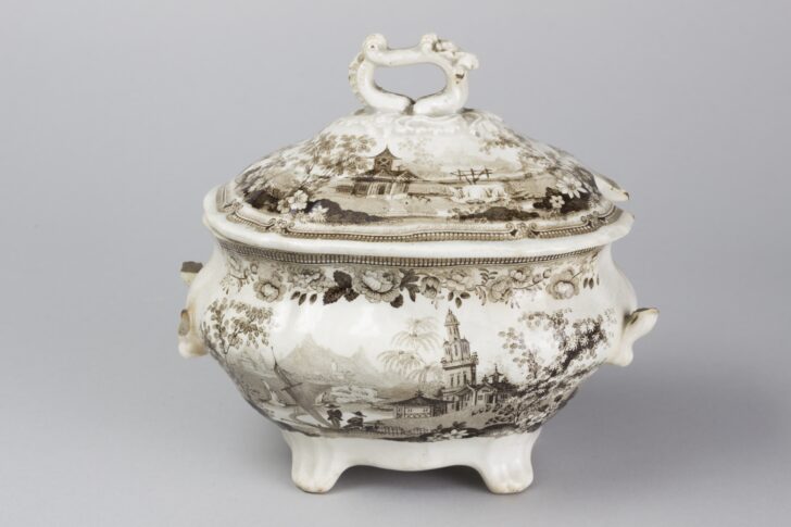 Small gravy dish on four feet with lid. Brown rose motifs, and small town scenes.
