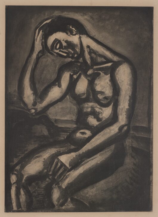 A nude, seated, female figure rendered in thick black lines rests her head, bent in profile, in her right hand. Her left hand rests on her lap.