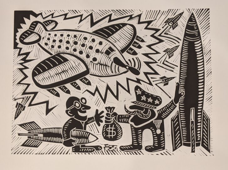 An airplane with missiles under its wings flies above two standing figures, both smiling. The figure on the viewer's left is bald, wearing glasses, and holds what appears to be a missile while reaching for a sack labeled with a dollar sign held out by the figure on the viewer's right. The figure on the right is wearing a hat with stars on it that covers his eyes, has a large mustache, and has a medal hanging on his shirt. He is holding his hand up to a large missile-like object behind him.