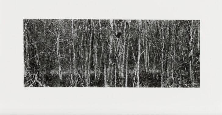 A black-and-white photograph of a swamp filled with trees. In the center, a nest is visible in the bare branches.