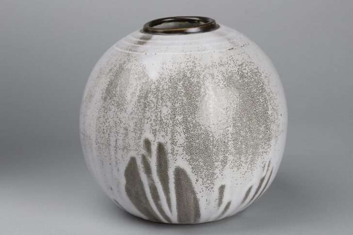 White glazed pot with a spherical shape. The underglaze is brown and creates a mottled pattern with the white overglaze.