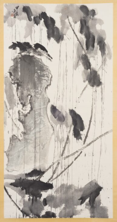 Image of a mountain in the backgroud with water and hills in the foreground. Structures and a fisherman are visible. The painting is mounted on a gold fabric with decorative floral designs.