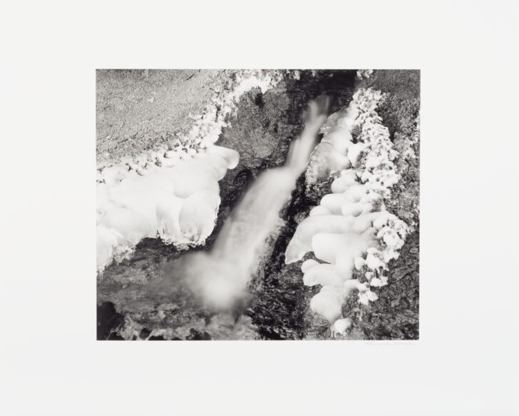 A blurred jet of water cuts between mineral, snow, and ice.