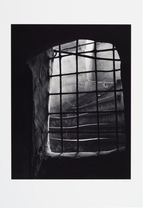 The view of a lit stairway from a dark interior, seen through a window covered in a grate of nine metal bars forming squares. The stairs have become concave, worn down through use or by the elements.