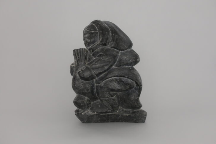 A carving in black stone of a man wearing a parka and boots, holding onto a seal with both hands.