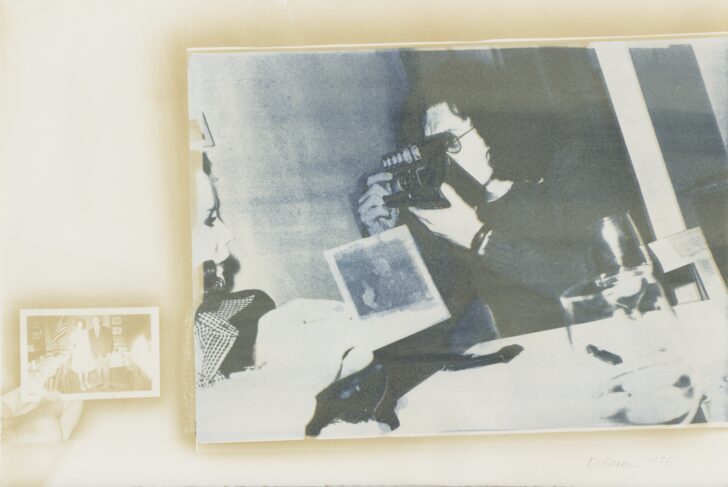 A collaged photography featuring a black-and-white photograph of an individual with a Polaroid camera with another individual's hand holding up a developing photograph. The image of the hand is duplicated in the lower left corner of the collage.