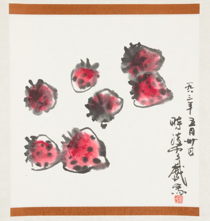 Image with seven strawberries. The work is mounted on a light green material with light brown borders.
