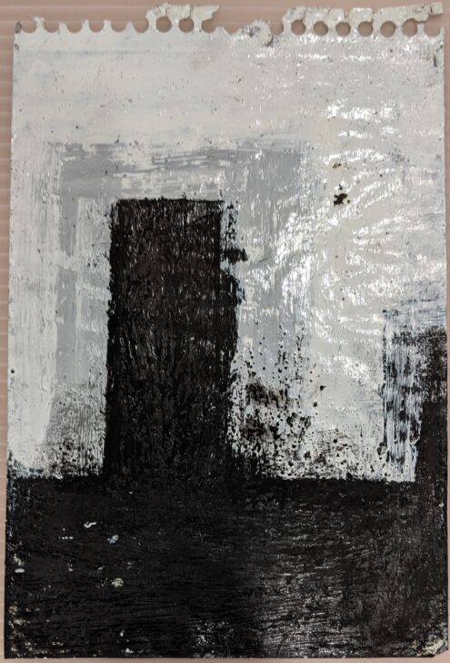 A vertically oriented black rectangle. Black shading fills the foreground, and there is white, grey, and some black shading in the background. The paper is from a notebook, with torn rings at the top.