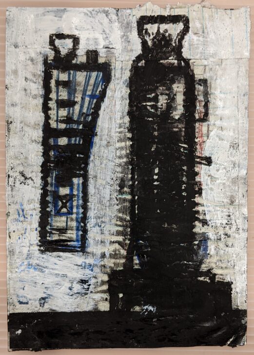 Two tall, black, rectangular structures. One structure is floating and one is extending upward from a black base on a white background. The piece is on a sheet of paper from a spiral binder with the cut edges of the paper still attached.